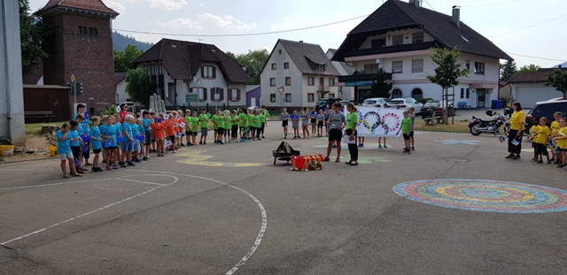 Unter dem Motto „Olympia ruft: Mach mit!“ fand am 25.Juli 2019 das Schulfest der Hörnlebergschule in Winden im Elztal statt. In den vorangegangenen Projekttagen beschäftigten sich die Schülerinnen und Schüler mit verschiedenen olympischen Sportarten, erstellten eigene olympische Fackeln, bereiteten nahrhafte Powerriegel zu und studierten allerlei Vorführungen und Tänze ein. Passend dazu konnten die Hörnleberg-Grundschüler in dieser Woche auch das Kinderturnabzeichen des DTB ablegen. Die offiziellen Urkunden wurden bei der Eröffnungsfeier durch Herrn Bürgermeister Hämmerle an die stolzen Sportlerinnen und Sportler überreicht. Außerdem freuten sich die Kinder besonders über die vom Förderverein der Hörnlebergschule e.V. teilweilse gesponsorten Funktions-T-Shirts in den Farben der olympischen Ringe. Bei besten Wetter und guter Laune fühlten sich alle sehr olympisch! Die Bewirtung und das tolle Buffet rundeten die Veranstaltung hervorragend ab und wurde von den Eltern der Hörnleberg-Grundschüler organisiert.