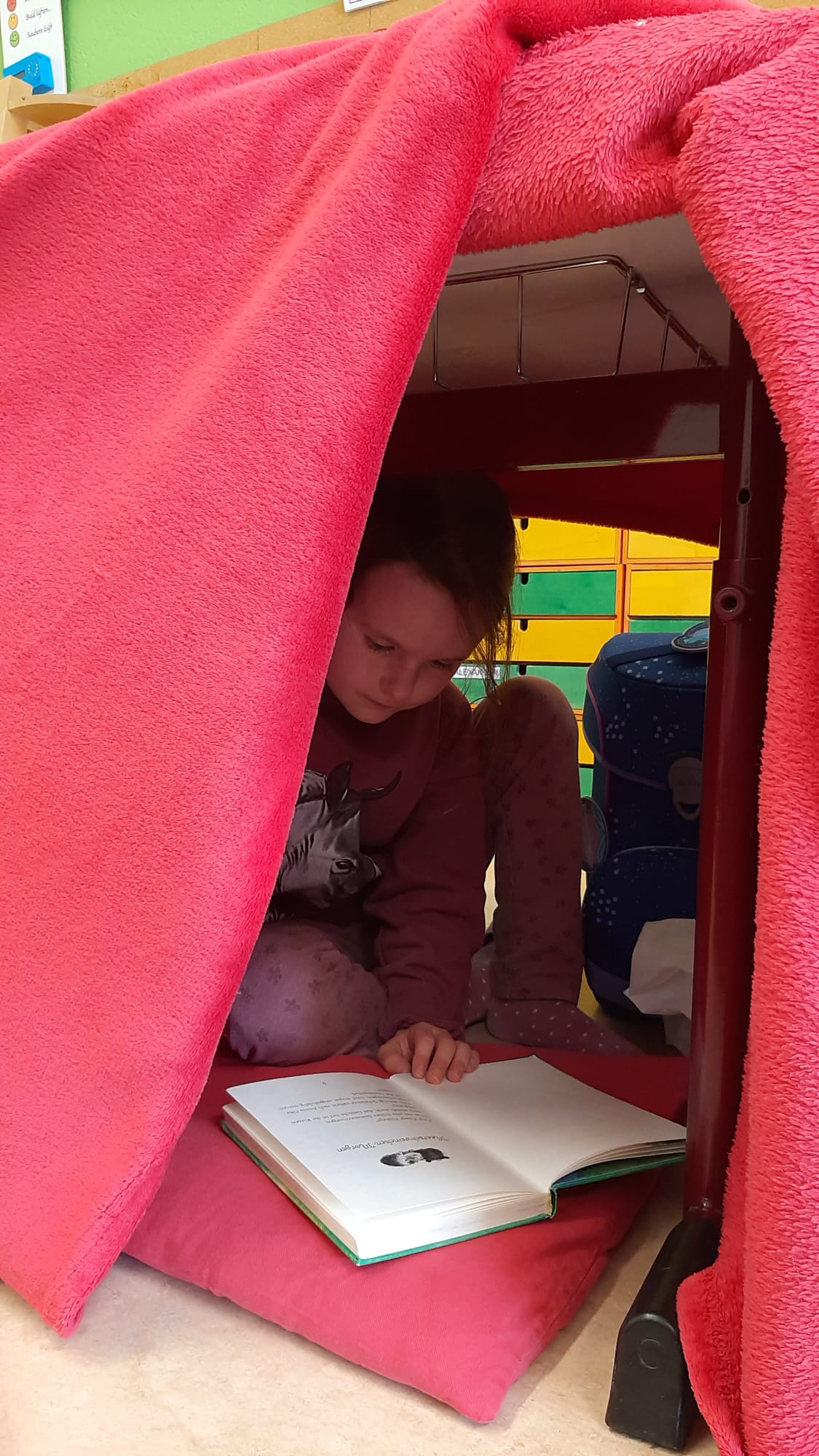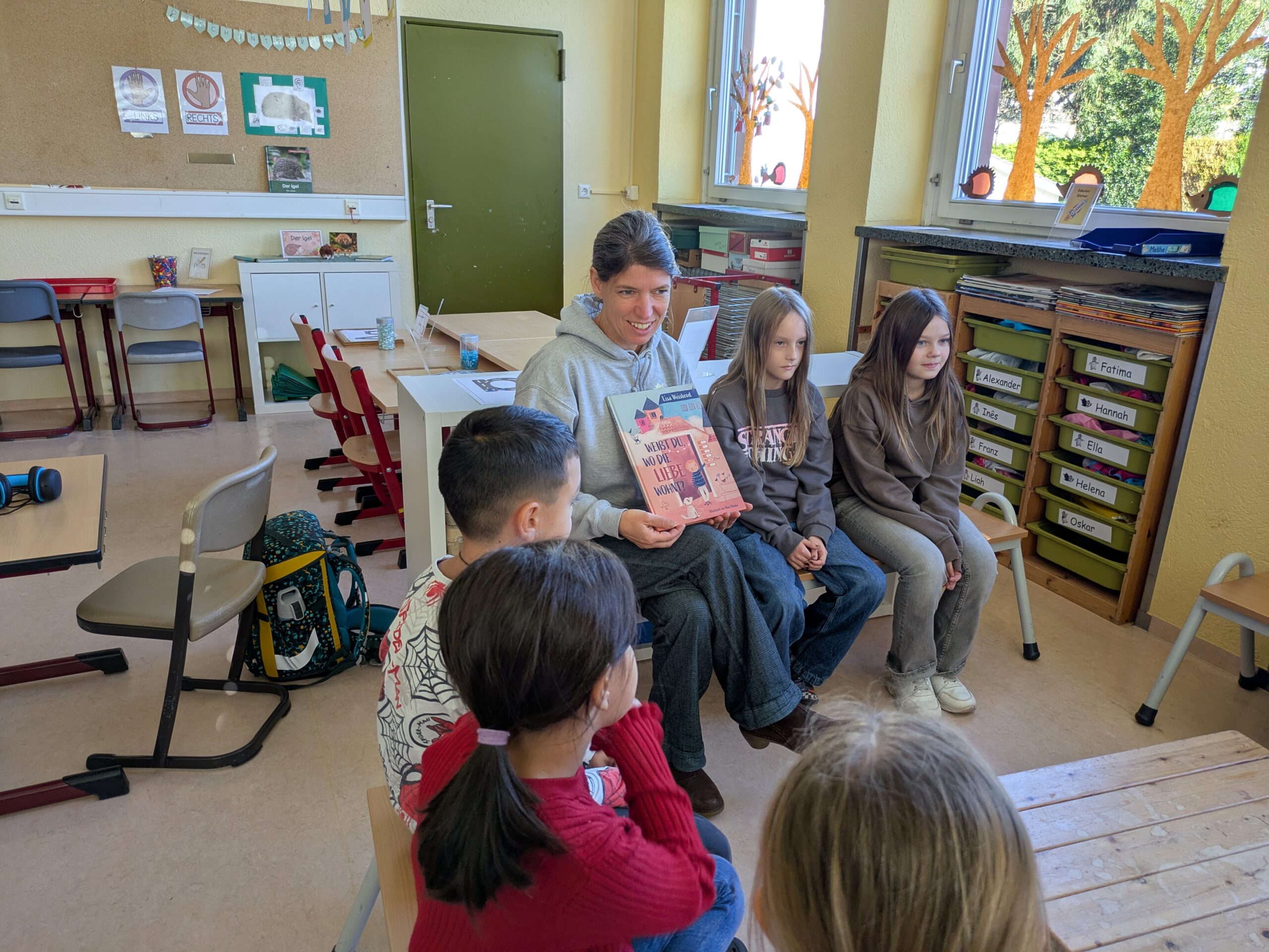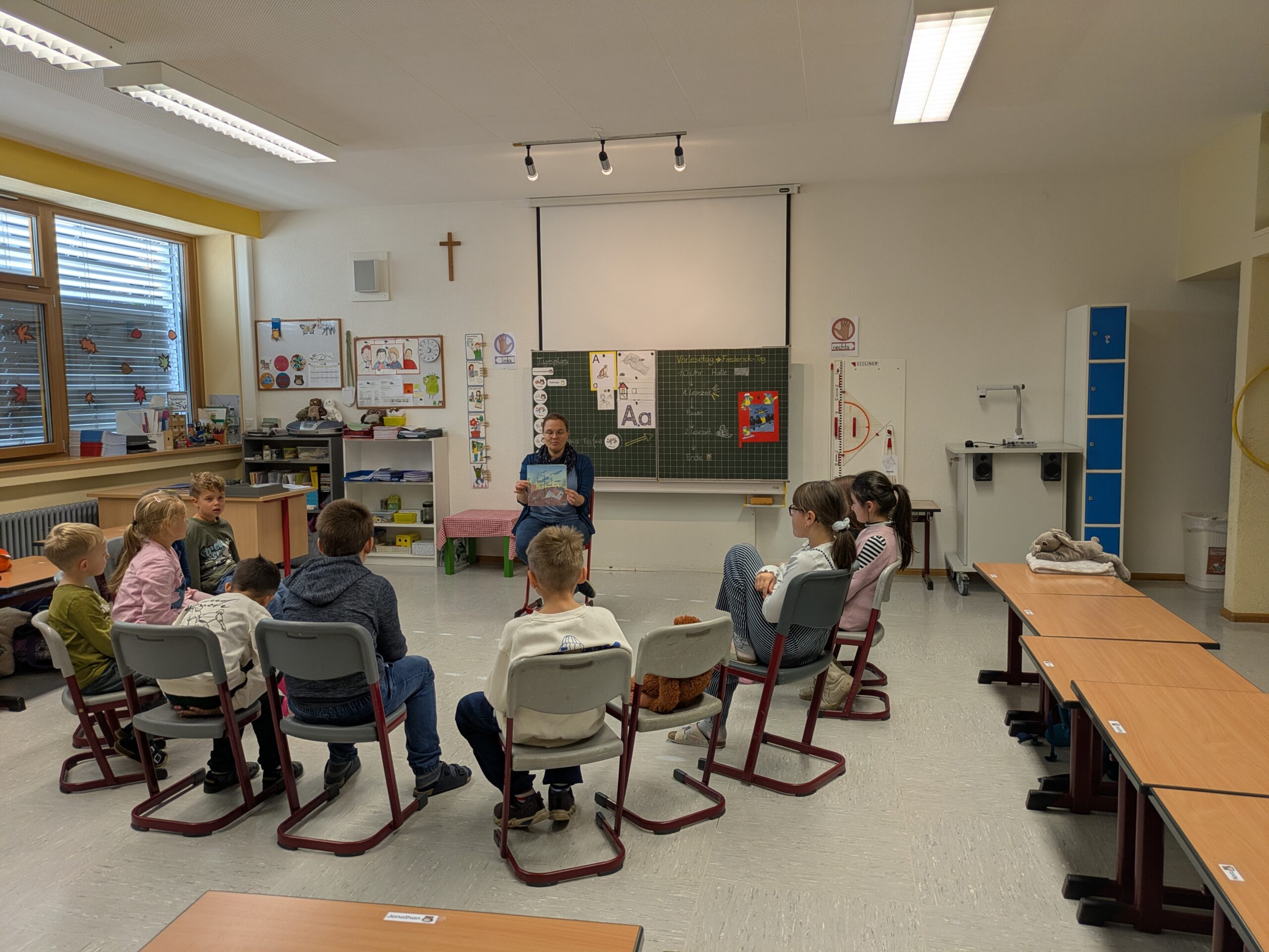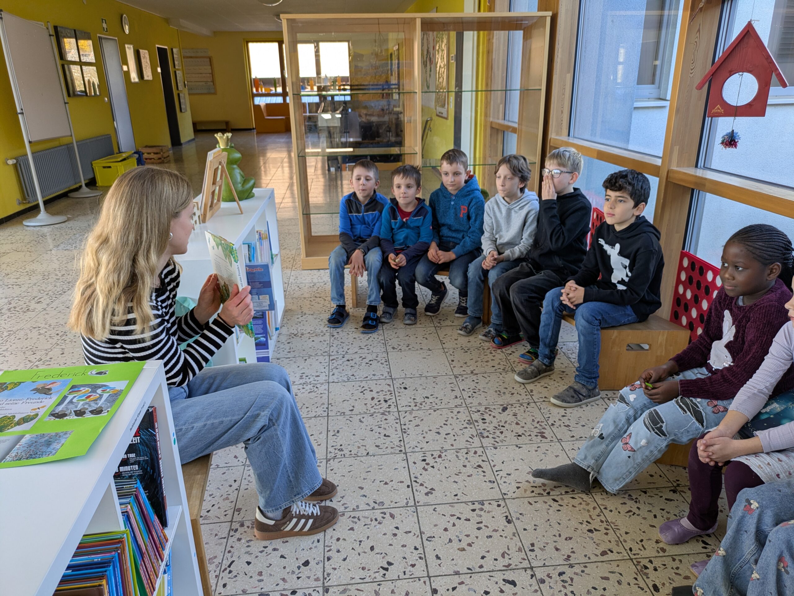 Beim diesjährigen Frederick Tag suchten sich die Schülerinnen und Schüler aus einer Auswahl an verschiedenen Titeln, ein spannendes Buch für das Lesekino aus. In klassenübergreifenden Gruppen hörten alle mit viel Interesse ihrer jeweiligen Vorleserin zu. Im Anschluss konnten die Kinder an einem von ihnen selbstgewählten „Lieblingsleseort“ in der Schule in einem von zu Hause mitgebrachten Buch lesen. Besonders toll war es für die Schülerinnen und Schüler verschiedene Leseorte auszuprobieren und heraus zu finden, was einen pefekten Ort zum Lesen überhaupt ausmacht.